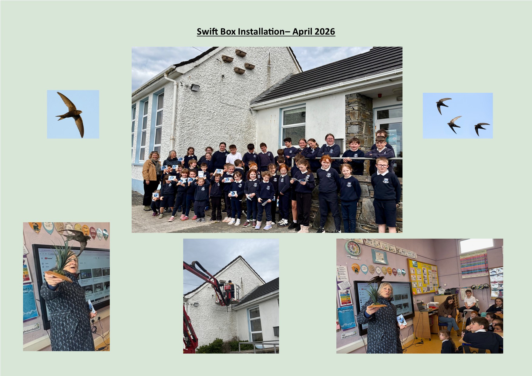 Yesterday we were delighted to complete our Swift Bird Boxes Project. Our bird boxes were generously sponsored by Sorcha O’ Toole- GRETB Letterfrack. We had fantastic guidance from Swift Conservation Ireland expert, Lynda Huxley and Lynda did an informative talk with the whole school. Thanks to Cleggan Tidy Towns who also kindly sponsored the cost of the cherry picker. Special thanks to Claude Reichard for being a driving force behind this project and we are very grateful to him for his wonderful organisation and co-ordination. We look forward to welcoming the swift birds to Claddaghduff N.S! #greenschools